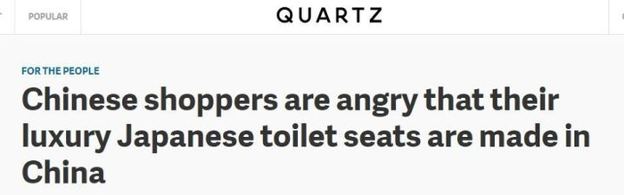 美国石英财经网站同一年刊登的一篇文章报道,一名赴日旅游的中国游客背回一台马桶盖后发现,原来这款马桶盖就是在自己家附近生产的。他抱怨道:“我这样不是成搬运工了吗?”