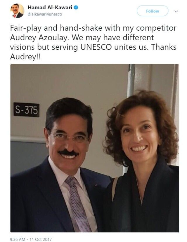 不过两位上述提及的总干事候选人却似乎并不认为有黑幕。昨天阿齐兹·卡瓦里还在社交网站贴出了下面这张他与阿祖莱的合影,互祝对方好运呢……