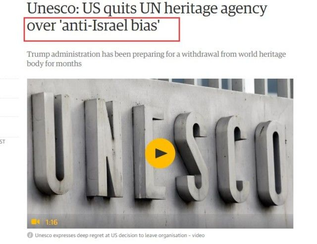 接下来则是重点了:其实美国这次退出联合国教课文组织,除了欠债的问题,一个更主要的缘由是美国政府认为联合国教科文组织“对以色列太不公平”,经常做出“反以色列”(anti-Israel)的决定。
