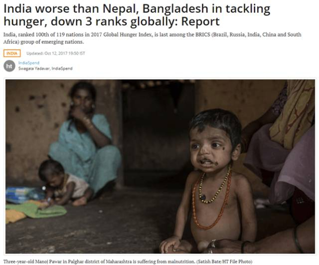《印度斯坦时报》:报告显示,印度在应对饥饿问题上比尼泊尔和孟加拉国还糟,排名下降三位。