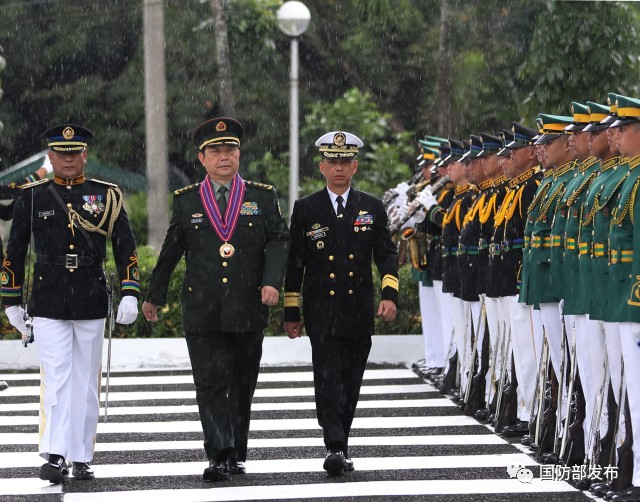 10月25日下午,国务委员兼国防部长常万全与菲律宾国防部长洛伦萨纳举行会谈。会谈前,常万全在菲军检阅指挥官的陪同下检阅菲军仪仗队。