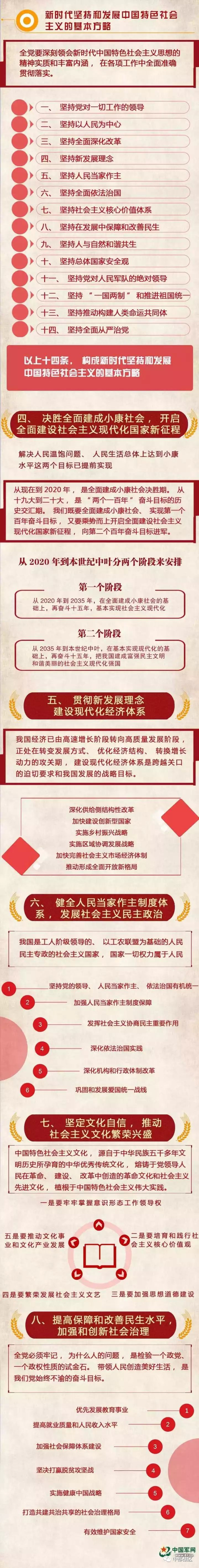 新时代中国特色社会主义思想,明确坚持和发展中国特色社会主义,总任务是实现社会主义现代化和中华民族伟大复兴,在全面建成小康社会的基础上,分两步走在本世纪中叶建成富强民主文明和谐美丽的社会主义现代化强国;明确新时代我国社会主要矛盾是人民日益增长的美好生活需要和不平衡不充分的发展之间的矛盾,必须坚持以人民为中心的发展思想,不断促进人的全面发展、全体人民共同富裕;明确中国特色社会主义事业总体布局是“五位一体”、战略布局是“四个全面”,强调坚定道路自信、理论自信、制度自信、文化自信;明确全面深化改革总目标是完善和发展中国特色社会主义制度、推进国家治理体系和治理能力现代化;明确全面推进依法治国总目标是建设中国特色社会主义法治体系、建设社会主义法治国家;明确党在新时代的强军目标是建设一支听党指挥、能打胜仗、作风优良的人民军队,把人民军队建设成为世界一流军队;明确中国特色大国外交要推动构建新型国际关系,推动构建人类命运共同体;明确中国特色社会主义最本质的特征是中国共产党领导,中国特色社会主义制度的最大优势是中国共产党领导,党是最高政治领导力量,提出新时代党的建设总要求,突出政治建设在党的建设中的重要地位。