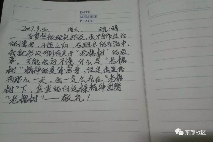 在小庞的日记本里,有这样一段话:“当梦想被现实打败,我不甘作生活的懦者,入伍之初,在班长的言语中,我就多次听到有关于‘老槐树’的故事,可能我还不懂什么是‘老槐树’精神的具体寓意,但是我坚信有那么一天,我一定会站在“老槐树”下,庄重的向这棵精神图腾‘老槐树’——敬礼!”
