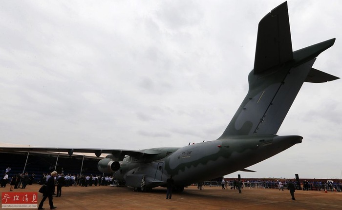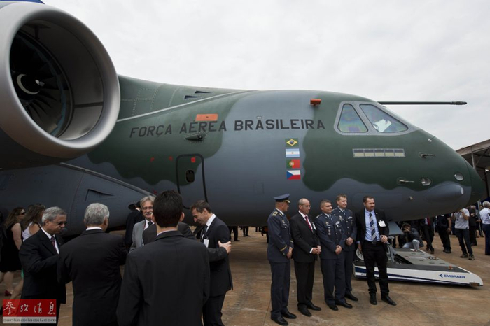 这是10月21日在巴西圣保罗州加维昂佩绍图拍摄的巴西最大国产运输机KC-390。巴西航空工业公司当日在圣保罗州加维昂佩绍图生产基地展示了其生产的最大型运输机KC-390。KC-390是一款用于运送部队和补给的运输机,同时也可执行搜救、森林火灾救险等任务,可运输26吨货物,时速可达870公里。