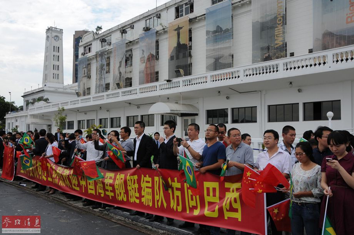 10月22日,在巴西里约热内卢,巴西华人华侨和中资企业代表列队欢迎中国舰艇编队。新华社记者赵焱摄