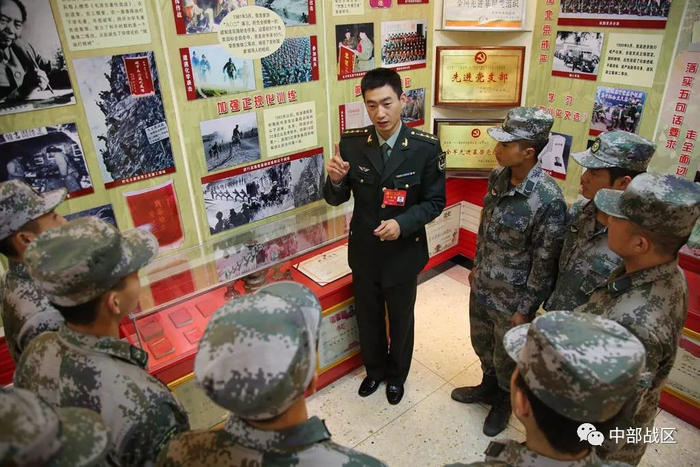 荣誉室里,党的十九大代表、“大功三连”指导员王金龙与官兵一起重温连队”煤油灯下学毛著“的光荣传统,激励官兵不忘初心牢记使命担当强军重任。