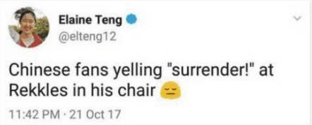 Elaine Teng在推文中写道,当Rekkles还留在座位上时,中国观众高呼“投降”。 目前她已删除这条推文。