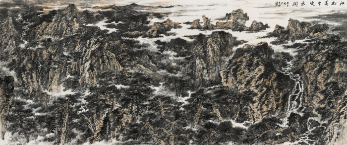 买鸿钧擅用皴法,小斧劈、大斧劈皆落落大方。《白岳道场》是买鸿钧用力甚勤的一幅作品。或许视山水为道场之缘故,此图展卷即有神山圣水的气息撩人心魄。近处,苍松虬然,黛玉覆翠,中景拉近勾皴,取其大势,以线的宛转交错带动墨色的浓淡干湿变化,所塑造之险绝崖壁,似欲从远景的峰峦叠嶂中奔突而出,声势夺人。晚霭明灭间,乱云飞渡,群峰鼓荡,似有金玉之声回荡于明泉幽壑,如洪钟骇听,声声入耳,令人心神浮游于尘境之外。他的笔墨苍中有润,繁中有简,形意相动,虚实相生,诡谲而不怪异,飘逸而不飘忽,北方山水的阔大畅意与南方山水的轻简空灵,在他的笔下往复穿行,浓者皴擦如电闪如斧劈,密不透风,淡者如浣纱如梦影,几无痕迹,更增添了整体的韵味变化和结构的生趣律动。