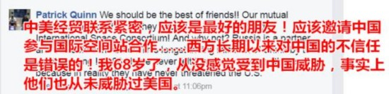 中美经贸联系紧密,应该是最好的朋友!应该邀请中国参与国际空间站合作……西方长期以来对中国的不信任是错误的!我68岁了,从没感觉受到中国威胁,事实上他们也从未威胁过美国。