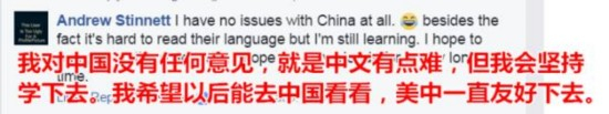 我对中国没有任何意见,就是中文有点难,但我会坚持学下去。我希望以后能去中国看看,美中一直友好下去。