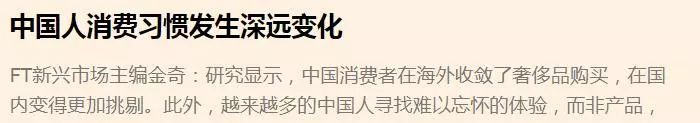 “他们在海外收敛了奢侈品购买,在国内变得更加挑剔。越来越多的中国人寻找难以忘怀的体验,而非产品”——英国《金融时报》在《中国人消费习惯发生深远变化》的文章中这样写道。