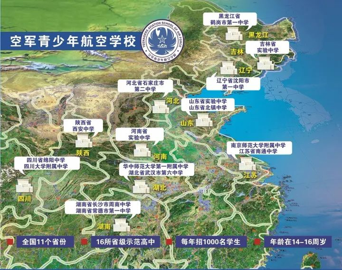 国家教育部明确,河北省石家庄市第二中学、辽宁省沈阳市第一中学、吉林省实验中学、黑龙江省鹤岗市第一中学、南京师范大学附属中学、江苏省南通中学、山东省实验中学、山东省北镇中学、河南省实验中学、华中师范大学第一附属中学、湖北省武汉市第六中学、湖南省长沙市周南中学、湖南省常德市第一中学、四川省绵阳中学、四川大学附属中学、陕西省西安中学等16所省级示范高中,为空军青少年航空学校承办中学,面向本省范围招收应届男性初中毕业生。