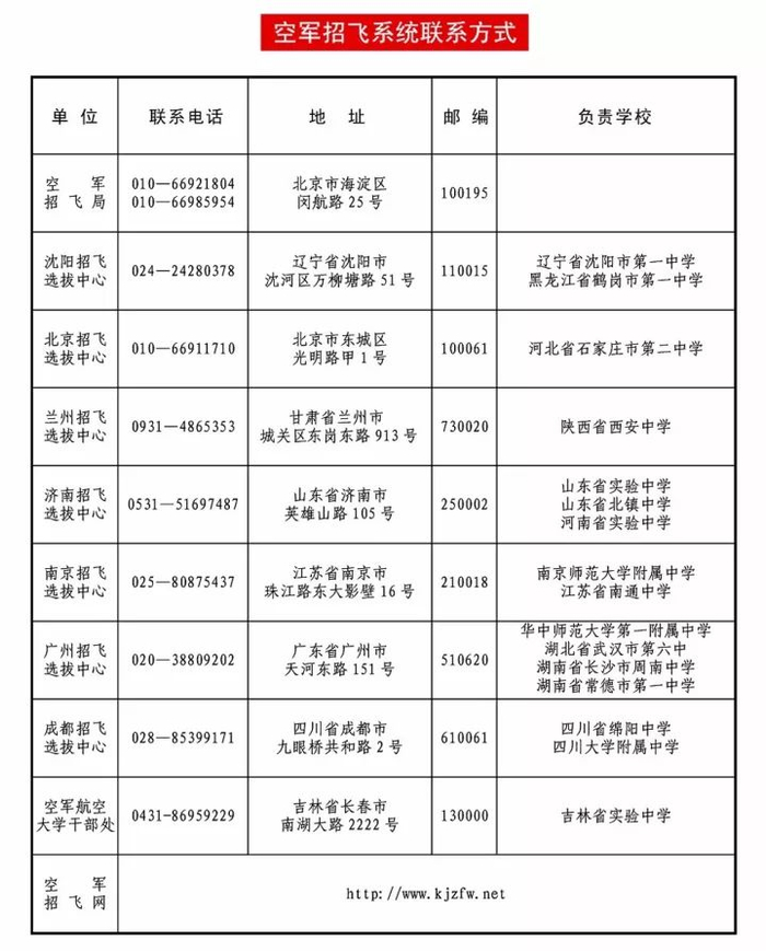 1. 空军青少年航空学校单列招生计划,不影响报考其他高中。参加招生检测食宿和交通费用由空军承担,考生不花一分钱。