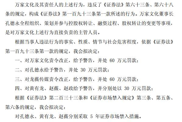 依据《证券法》规定,对万家文化责令改正,给予警告,并处 60 万元罚款;对孔德永给予警告,并处 30 万元罚款;对龙薇传媒责令改正,给予警告,并处 60 万元罚款;对黄有龙、赵薇、赵政给予警告,并分别处以 30 万元罚款;