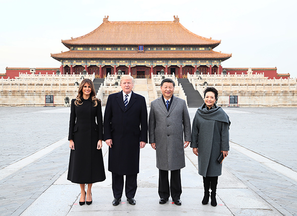 11月8日,国家主席习近平和夫人彭丽媛陪同来华进行国事访问的美国总统特朗普和夫人梅拉尼娅参观故宫博物院。这是两国元首夫妇在太和殿广场合影。  新华社 图