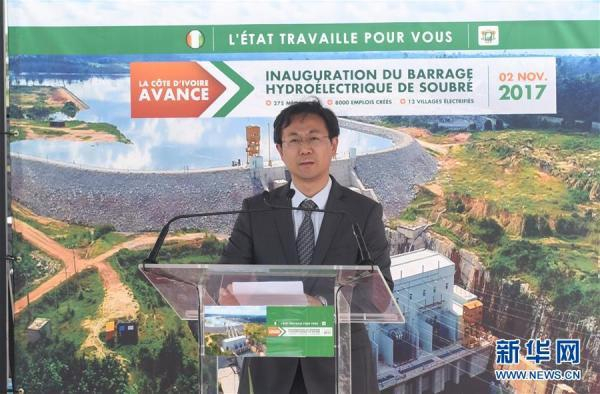 11月2日,在科特迪瓦苏布雷,中国驻科大使馆临时代办王军在苏布雷水电站竣工典礼上致辞。 新华社 图