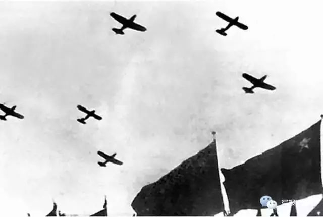 人民解放军第一个飞行中队的17架飞机,从南苑机场起飞,通过天安门上空,接受党和国家领导人的检阅。