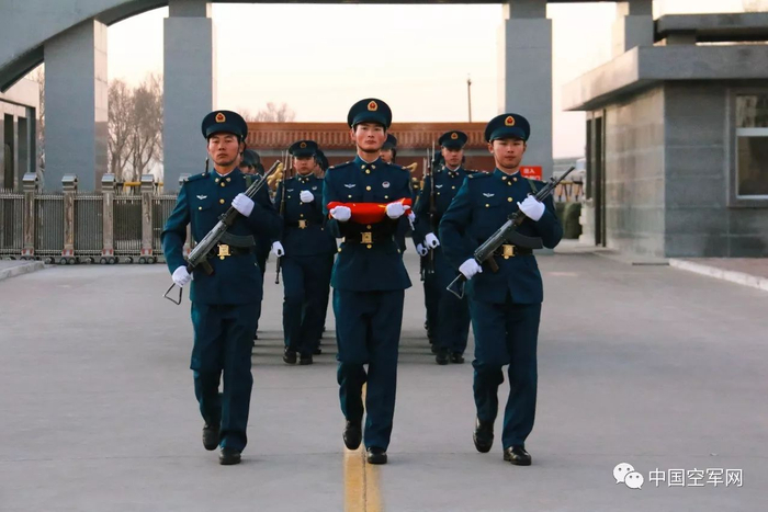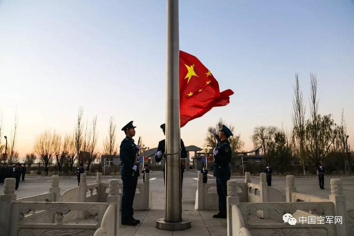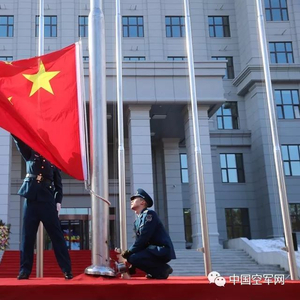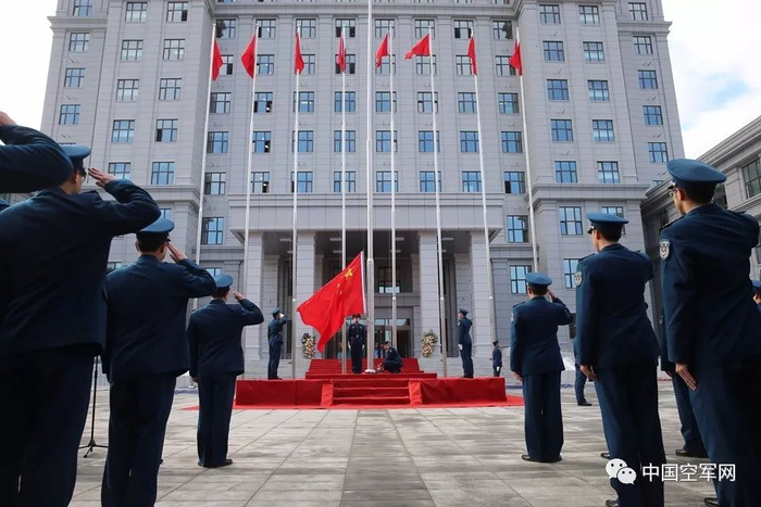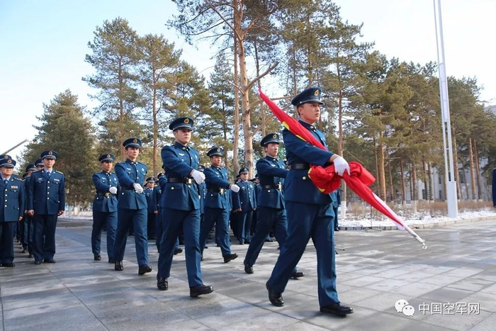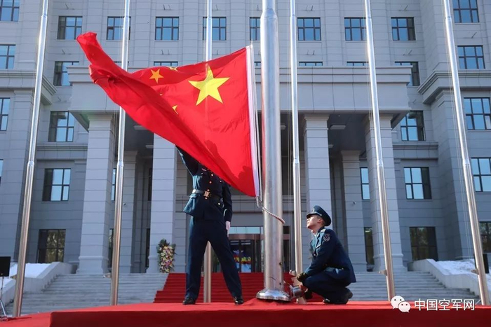 “飞翔,飞翔,乘着长风飞翔,中国空军在烽火中成长……”伴着雄壮的《空军进行曲》,升旗仪式正式开始。护旗方队整装集结,持枪方队铿锵行进,做好出旗准备。
