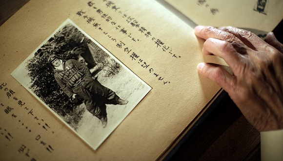 2015年4月29日,日本茨城县笠间市,在二战中幸存下来的神风特攻队飞行员Yoshiomi Yanai展示自己在1945年参加神风特攻队时的遗愿、遗嘱以及当时的照片。图片来源:东方IC