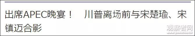 多家台媒将此作为标题进行报道。台湾东森新闻云12日还报道称,宋楚瑜不时隔着泰国总理巴育,“与特朗普聊上两句”,特朗普“离场前也不忘跟宋楚瑜、宋镇迈(宋楚瑜女儿)合影留念”。