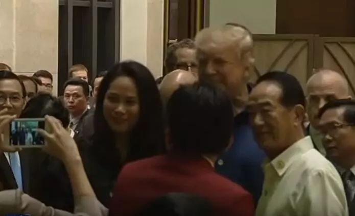在特朗普与泰国总理巴育合影后,宋楚瑜从特朗普身后蹭过来,向特朗普指自己的女儿。
