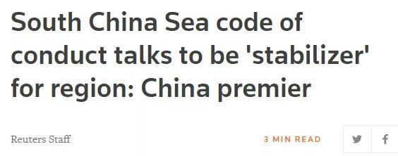 路透社在第一时间发布了这个重大消息。报道称,中国总理李克强在第20次中国-东盟领导人会议上表示,中方期待“南海行为准则”成为维护南海和平的“稳定器”,“中国最希望南海保持和平稳定”。