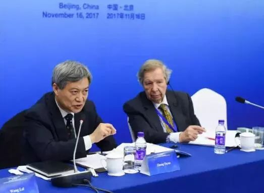 ▲中国社会科学院世界经济与政治研究所所长张宇燕(左)在“中共十九大:中国发展和世界意义”国际智库研讨会的平行会议上发言(11月16日摄)。新华社记者 陈晔华 摄