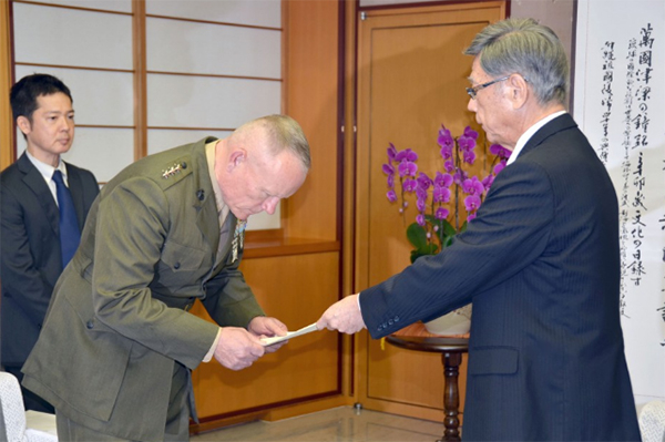 海外网11月20日电 11月19日,冲绳那霸一美军士兵醉驾撞死日本老人。20日,冲绳县知事翁长雄志向驻日美军提出强烈抗议,称美军不是“好邻居”,而驻日本冲绳美军最高长官尼克尔森中将则向冲绳县知事鞠躬道歉。