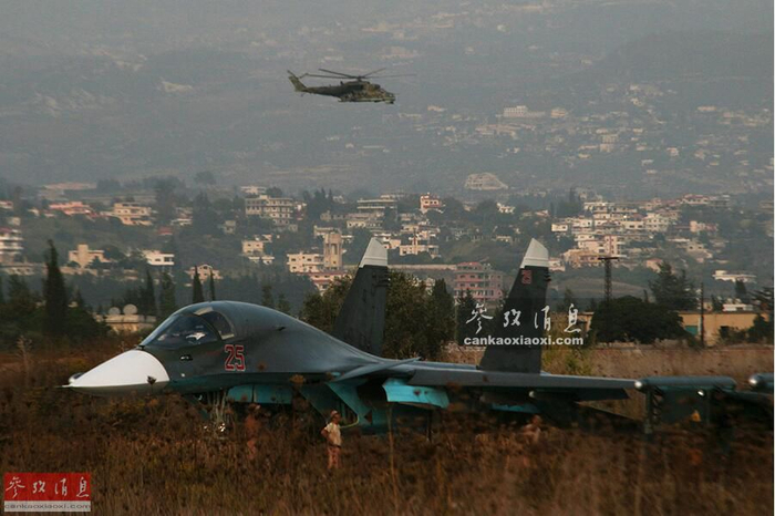在真实世界的作战行动中发现小故障并非是不寻常的。事实上,在战时条件下,在即使服役多年的成熟战斗机上也经常会发现问题。俄罗斯从在叙利亚的冒险经历中汲取了经验教训,并且正融入其知识之中。最终,这意味着俄罗斯空军会变得更加强大。图为停放在机场跑道旁的苏-34战机,空中能看到一架负责基地保卫任务的米-24武装直升机在巡逻。