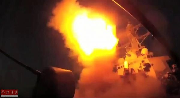 资料图片:图为网络上公开的美军战舰向叙利亚发射战斧导弹视频截图。