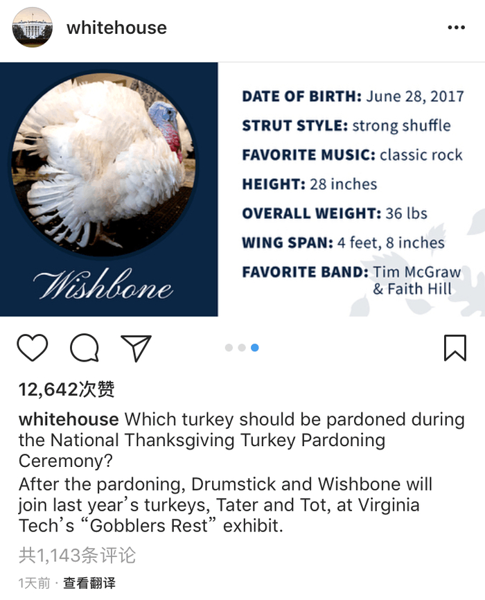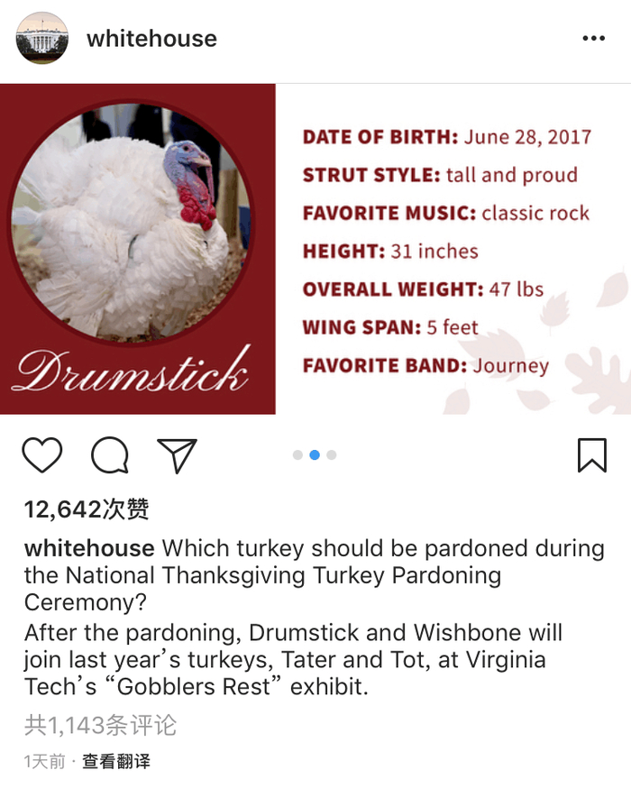 特朗普说,他与第一夫人欢迎过很多特别客人到白宫,包括世界领袖、国会议员,以及顺路几只奇怪的鸟,但从未迎接过有如今日华丽的贵宾访客Drumstick。特朗普宣布Wishbone和Drumstick,将与去年前总统奥巴马赦免的火鸡“塔特”和“托特”,一同在弗吉尼亚理工大学校园安度余生。