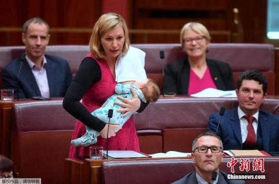 资料图:当地时间6月22日,澳大利亚堪培拉,来自绿党的澳大利亚参议员拉里萨·沃特斯在议会大厦发表演讲时,为她的女儿亚丽亚·乔伊喂奶。