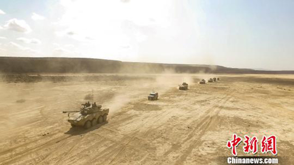 荒漠深处,炮声轰轰。只见数辆轮式突击车和步战车一字排开,随着指挥员一声令下,数十发炮弹精准命中靶标。停止间射击完成后,各型战车又轮番展开运动中射击训练。此外,参训官兵还与战车一起开展协同作战演练,穿插运用自动步枪、班用轻机枪、狙击步枪、车载高射机枪和并列机枪位对目标实施打击。