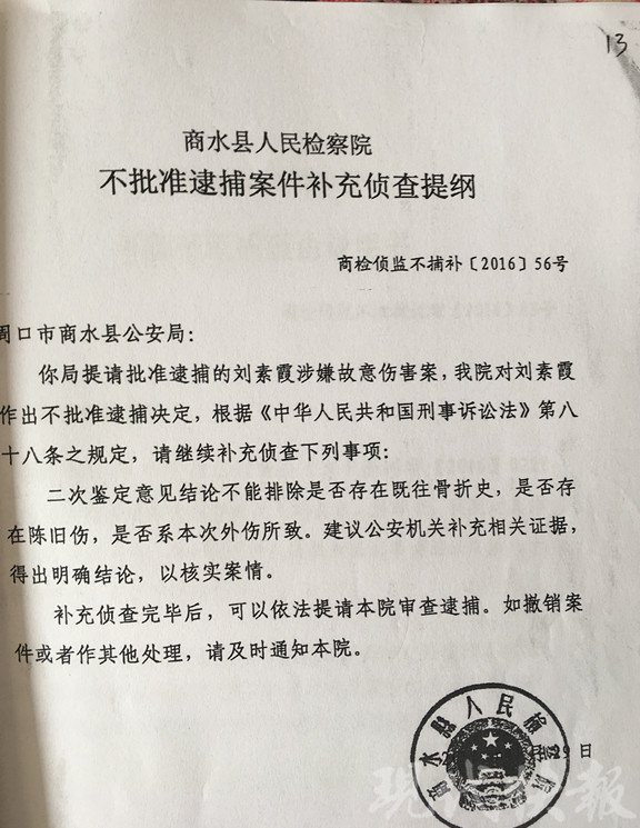 而在这之前,商水县公安局先后委托商水县和周口市公安局法医对吴某某的骨折进行了伤情鉴定,虽然两次法医鉴定结果都认定吴某某手部损伤客观存在,但都没表明此损伤是刘素霞造成的,因此,2016年8月30日商水县人民检察院没有批准公安局对刘素霞实施逮捕,下达了《不批准逮捕案件补充侦查提纲》。
