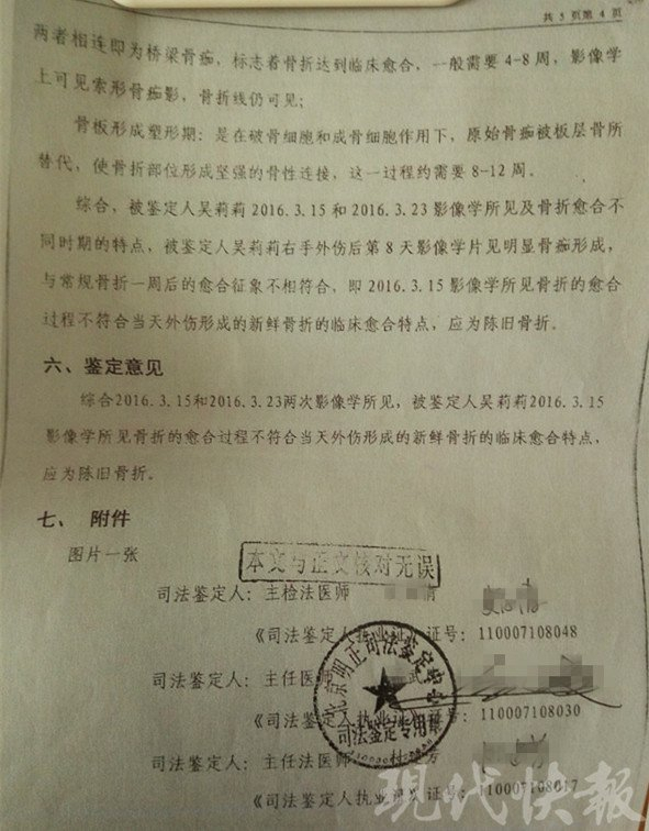 "我当时就向警察表示抗议,因为我听说吴某某春节时曾因为骑电动车摔跤导致手骨折,她的手骨折应该是陈旧伤,更何况那天我根本就没有打着她,纠纷发生后她还能灵活自如的玩手机啊!"刘素霞认为吴某某串通医院的人作伪证,把旧伤伪装新伤陷害她。于是,她委托家人去吴某某就诊的周口市中心医院调出了当天吴某某所拍的医学影像资料,并于2016年8月下旬前往商水县医院、上海华东医院进行鉴定,两者的诊断意见书均表示"右手第五掌骨中、远端骨折,有骨痂形成"。刘素霞据此认为吴某某的骨折为陈旧伤,但是商水警方不予认定。