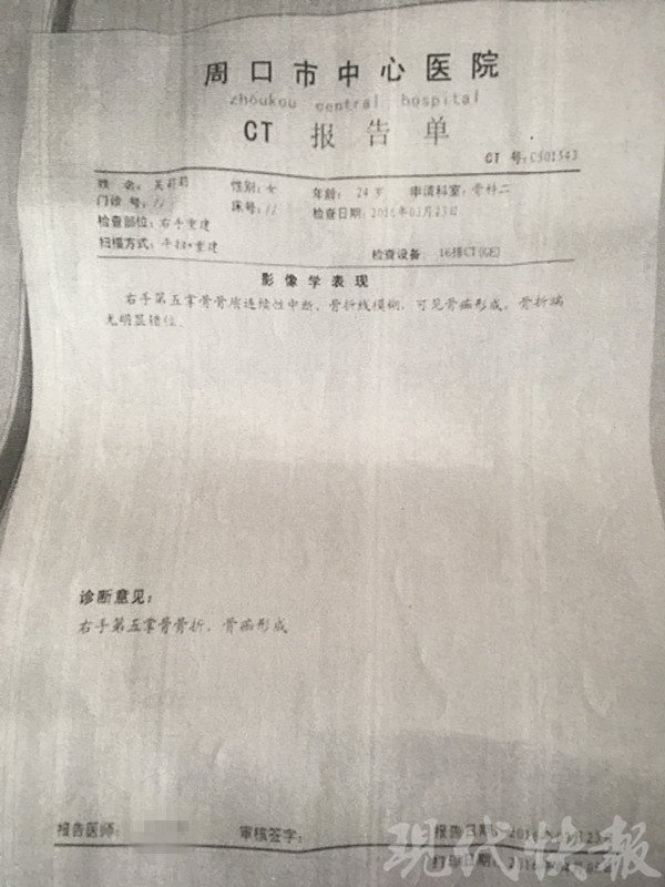 女子被错关261天:周口医院对吴莉莉骨折诊断意见