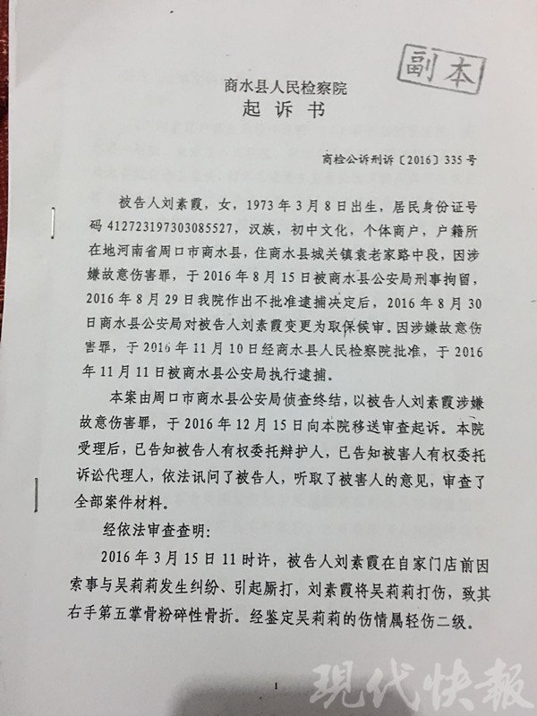 刘素霞是周口市商水县的一位个体工商户,开了一家经营烟酒副食品的杂货店,据她介绍,她和开饭店的邻居吴某某一家素有矛盾。2016年3月15日,两家人因琐事引发了激烈的冲突。后两家人经警方调解,分别前往周口市眼科医院和周口市中心医院就医并做伤情鉴定。冲突中刘素霞的眼睛被打伤,经周口市眼科医院鉴定为轻微伤。2016年4月16日,当刘素霞前往警察局询问相关案情进展时却被告知,"吴某某右手骨折,经鉴定为轻伤二级。" 2016年8月15日,商水县公安局以涉嫌故意伤害罪对刘素霞进行了刑事拘留,8月30日变更为取保候审。