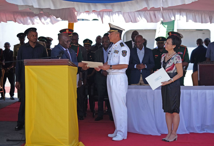 ▲坦桑尼亚总统马古富力在欢送仪式上,与“和谐使命-2017“任务指挥员领导、中国驻坦大使王克及坦军政官员以和平方舟医院船为背景合影留念