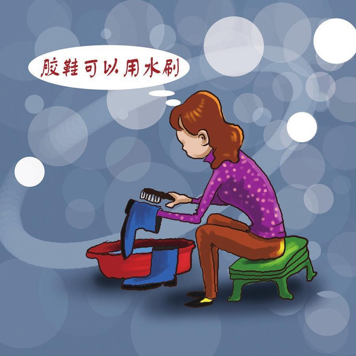2、靴子:用抹布或旧衣服蘸水擦拭,用刷子刷,胶鞋可以用水洗。
