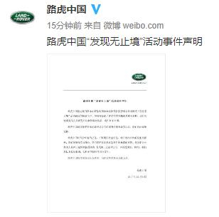 其在声明中称,路虎中国以保护环境为己任,长期履行社会责任,对于此次事件的发生及影响,我们深感愧疚与痛心。我们将严肃反思此次事件所暴露的问题,并决定企业相关人员即日起停职接受调查,责成第三方活动公司一并接受调查。同时,我们将认真总结教训,以杜绝类似事件再次发生。