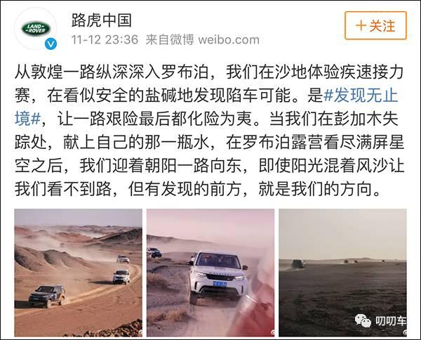 路虎汽车的官方微博此前置顶着一条“发现无止境”活动的视频,路虎发现车队穿越无人区罗布泊。文案写得也是“振奋人心”:“浩瀚星河之下,我们枕梦星空,眠宿砂砾,用滚滚车轮接受无人区的试炼;发现不止,我们的脚步亦不曾停止……”