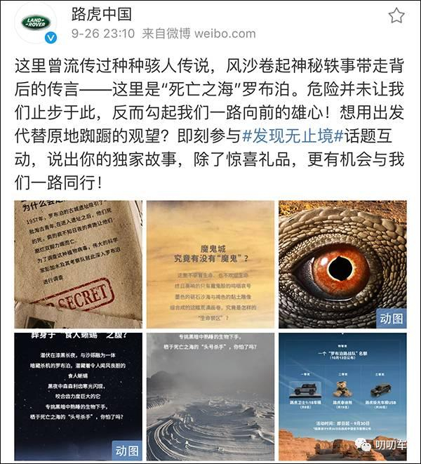翻看@路虎中国 此前的微博,“发现无止境”活动在今年9月已经开始,在该微博上已发布了十多条消息,可见这是策划已久的大型宣传活动。