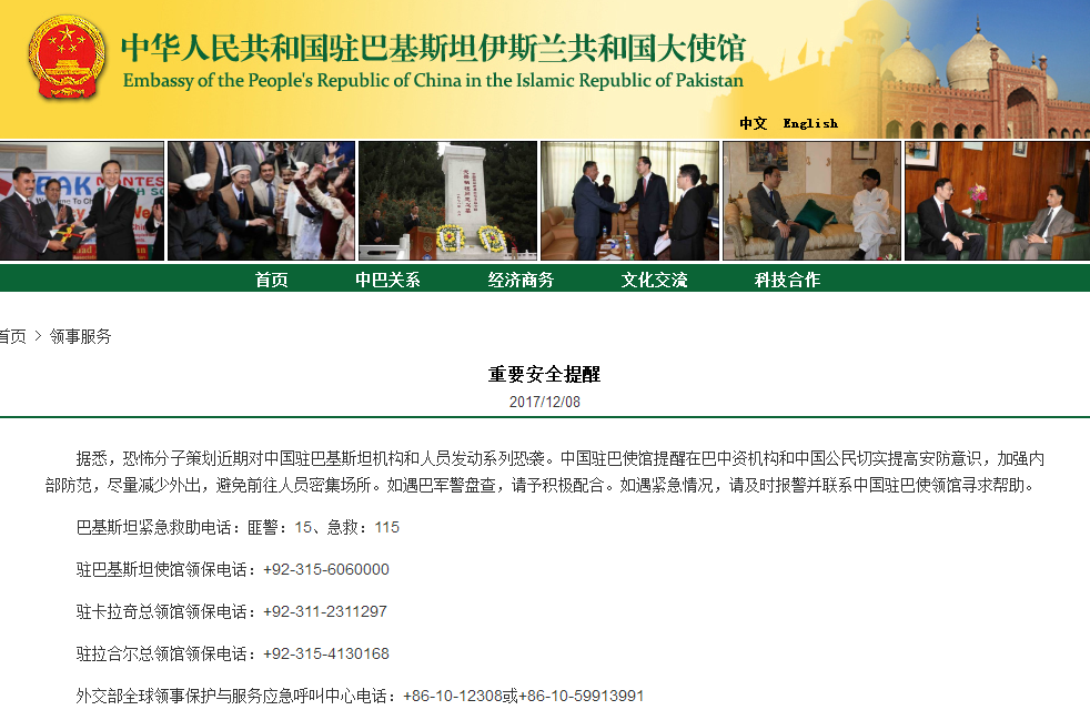 中使馆:恐怖分子欲对中国驻巴基斯坦机构恐袭