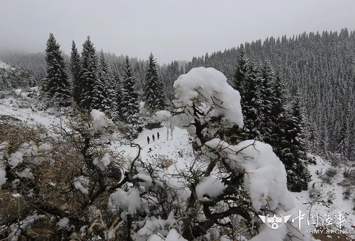新疆军区某部官兵冒着大雪在零下20摄氏度的天山深处拉练。(李 翔 摄)