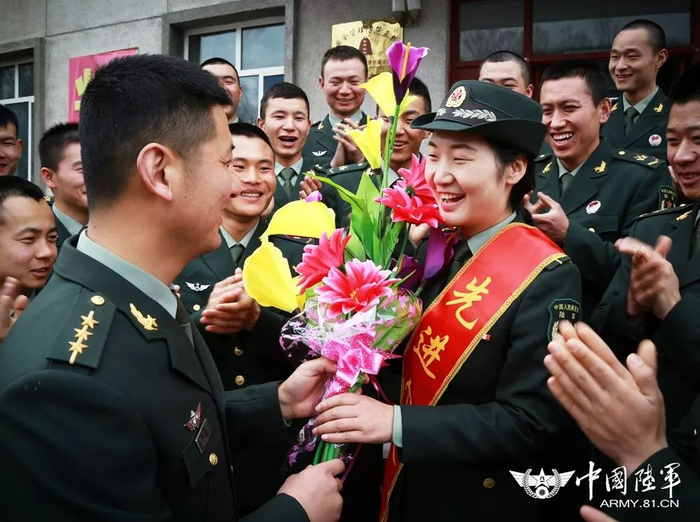 “老婆,你辛苦了!”新疆军区某部钱瑛被评为优秀机关干部后,丈夫邵宏前来献花表示祝贺。 (袁 凯 摄)