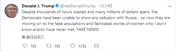 对于有关性骚扰的指控,特朗普本周二(12日)在Twitter上写道,“尽管浪费了数千小时,花费了数百万美元,但民主党人却无法证明我与俄罗斯勾结,所以现在他们正在继续进行虚假指控, 编造一些与我不认识或从未谋面的女性的故事。假新闻!”