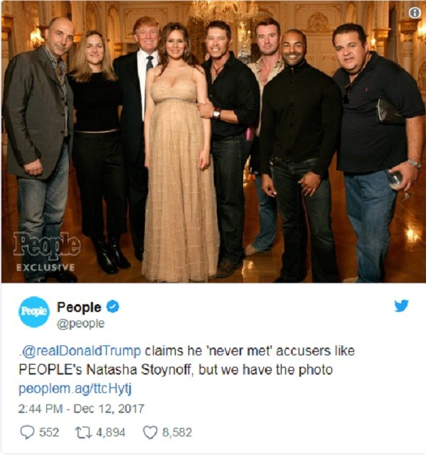 据美国中文网报道,在美国总统特朗普声称他从来没有见过指控其性骚扰的女性后,美国《人物》杂志则于周二(12日)通过推特发布照片,照片显示的是特朗普2005年12月与《人物》杂志记者娜塔莎·斯托伊诺夫(Natasha Stoynoff)等人在海湖庄园的合照,而当时正在怀孕的特朗普夫人梅拉尼娅也在合照中。