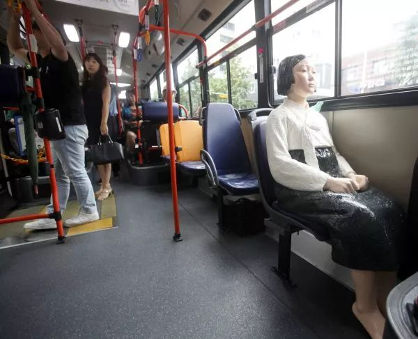 ▲资料图片:8月14日,在韩国首尔,人们乘坐载有“慰安妇”少女像的151路公交车。