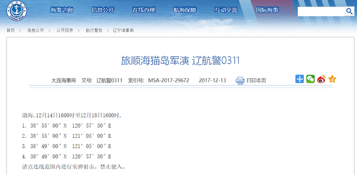 海外网12月14日电 国家海事局在官方网站发布航行警告,12月14日1600时至12月18日1600时,在旅顺海猫岛附近将进行军演,禁止驶入。
