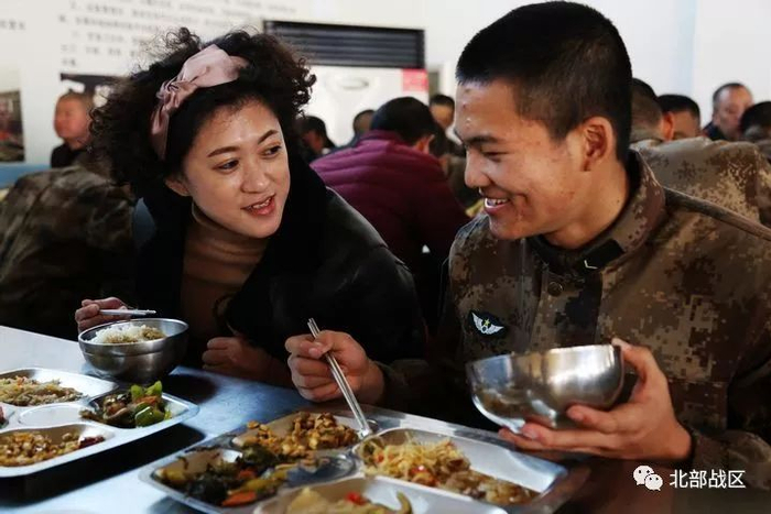 新兵吴继淳的妈妈激动地为孩子和一等功侄儿吴志辉合影留念,并勉励孩子要奋发图强,时刻以堂哥为榜样,有朝一日也能在胸前挂满军功章,为国争光。